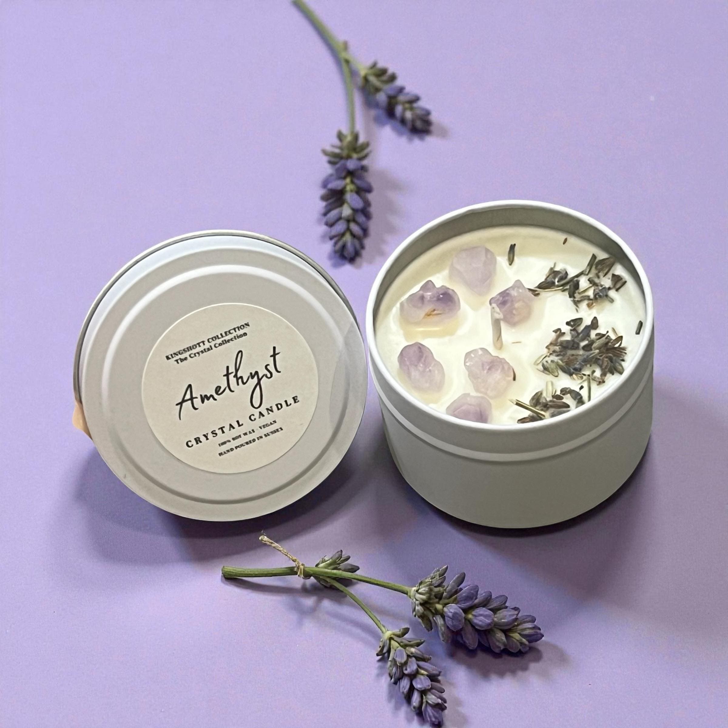 Treat yourself to this gorgeous Amethyst candle complete with polished Amethyst crystals set on top of the candle.